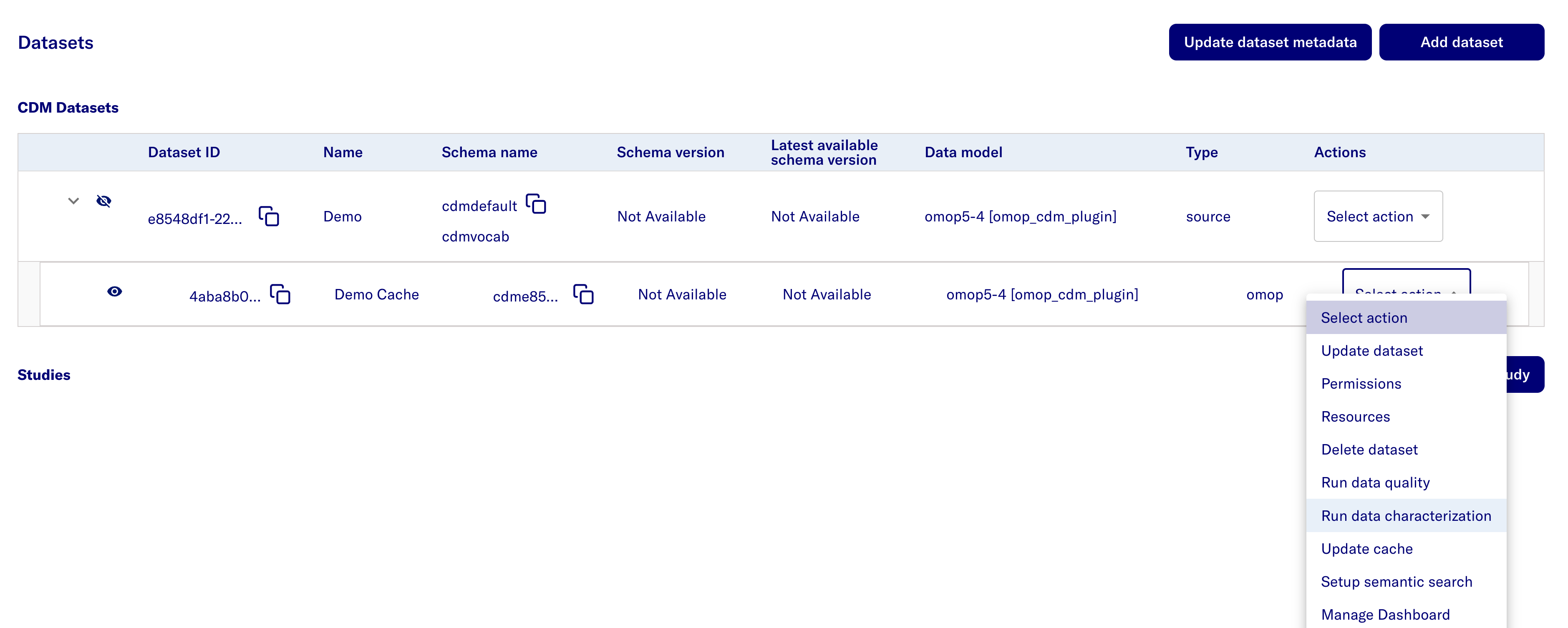 - Uncollapse the source dataset to views its cache dataset and click Select Action.